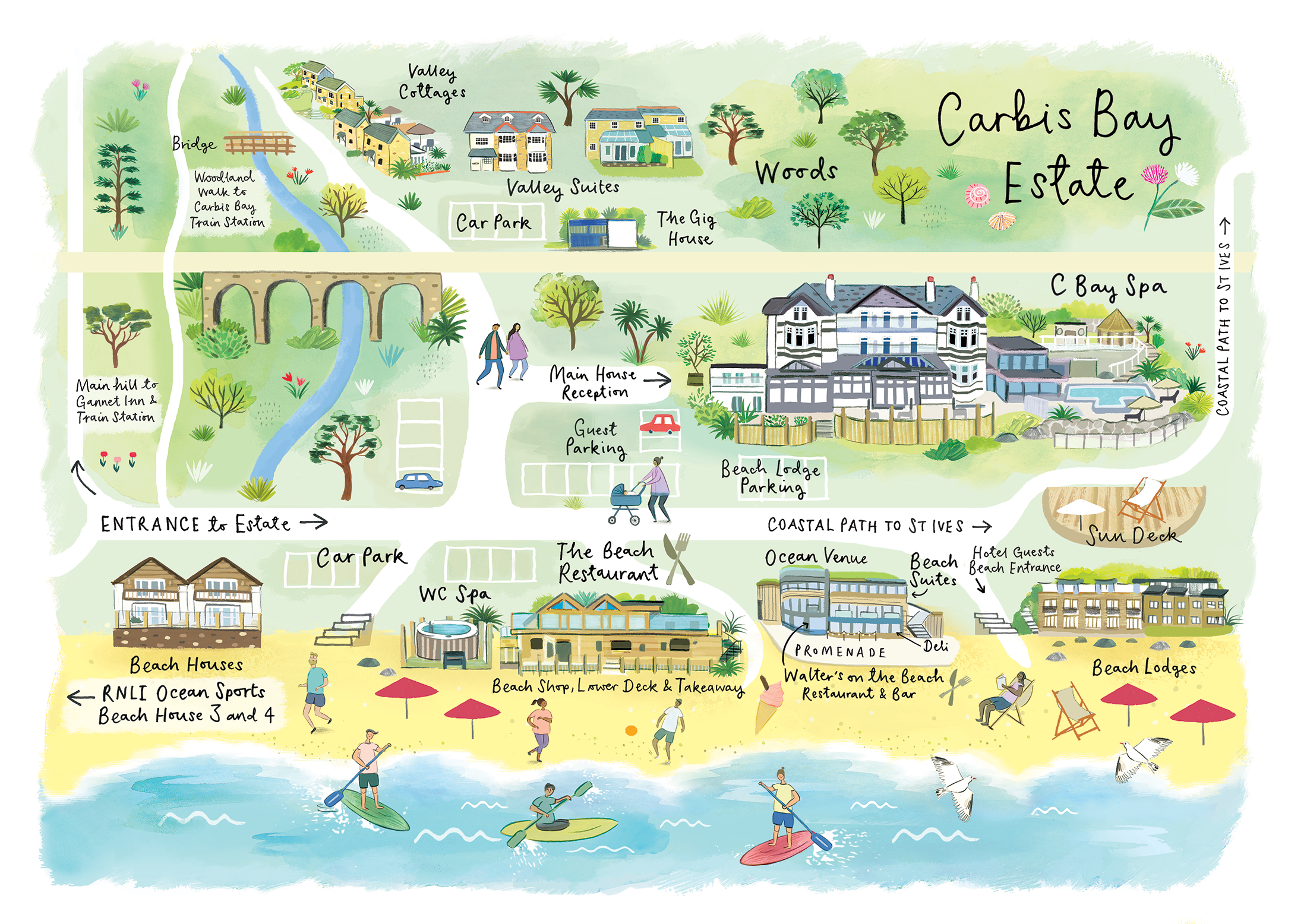 Artist Claire Rossiter was commissioned to create our wonderfully illustrated Estate Map. Printed copies are available from reception. Please take one home with you.